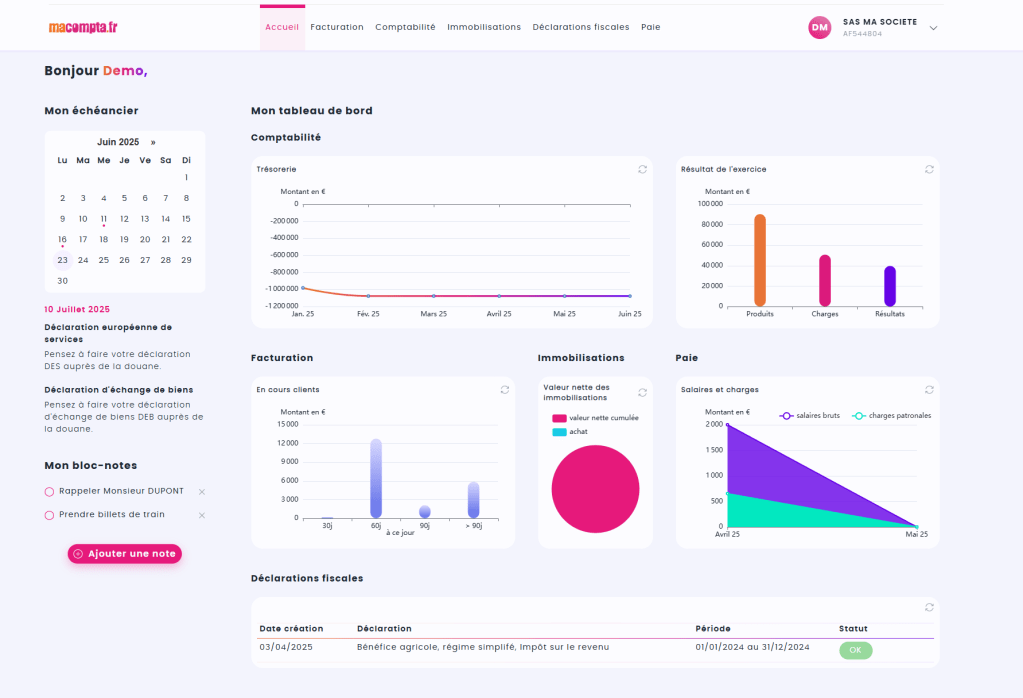 Suivez en temps réel la gestion de votre entreprise grâce au tableau de bord macompta.fr : trésorerie, résultat, encours clients, immobilisations, salaires et charges… vous avez une vision claire et synthétique de votre activité.